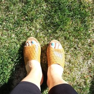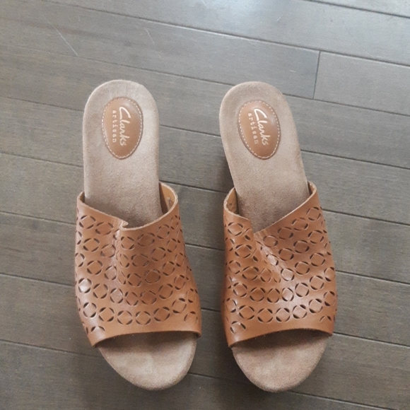 Tan summer wedges go with everything. Clarks are known for their comfort...you can wear these all day! These leather sandals were worn once.