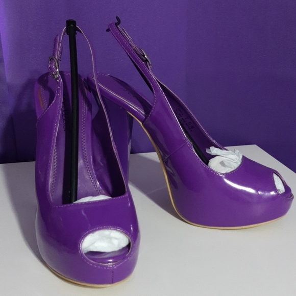 Purple 5" platform heels in original box, packaging and cloth bag for travel. Worn handful of times.