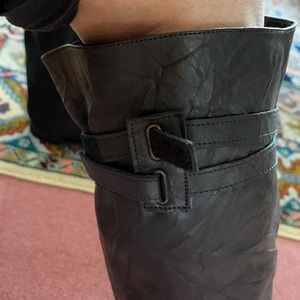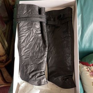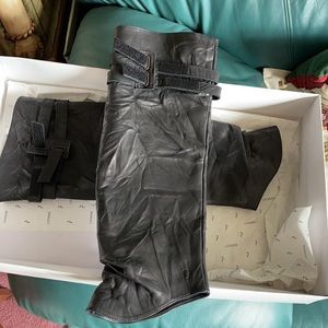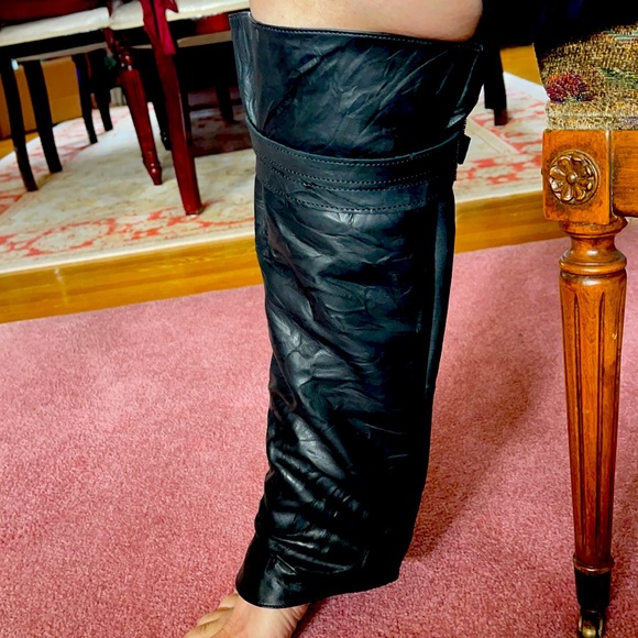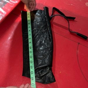 Beautiful embossed leather calf sleeves, with a few scrunched pleats on the top of of your foot. Has two adjustable Velcro tabs at the top side. For some cool nights when you don’t want to wear a pair of boots. Wear these leg sleeves and your favorite pair of shoes. Will look very unique and fashionable paired with your favorite shoes or bootie. Sandal not included.