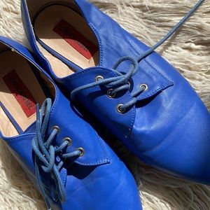 Blue pointed flats with laces with some wear at the tips