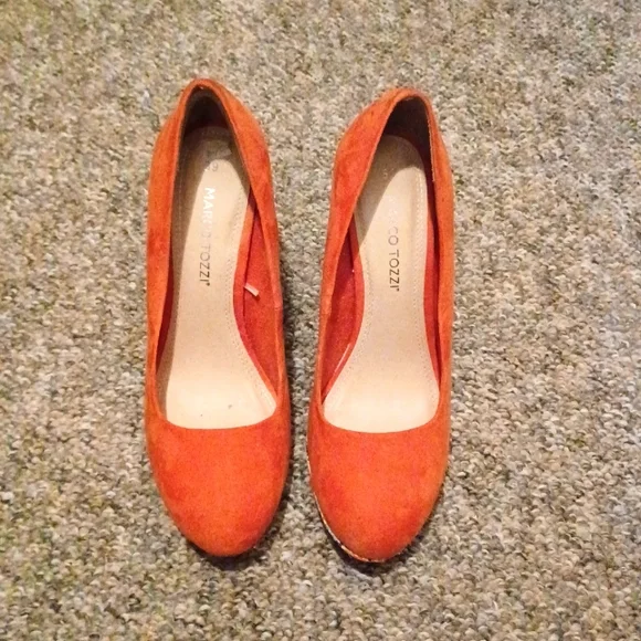 Tangerine suede shoes. Embellished sole and heal. The ebellishment has enough blue that they would look great with jeans. Purchased in Rome. Worn once.