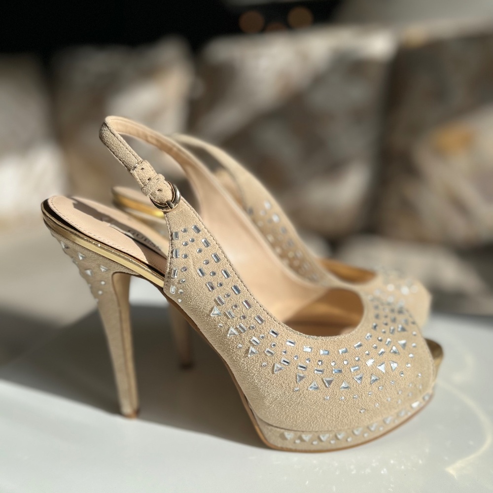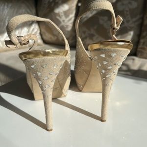 Gently worn 5.5” heel, 8M, beige with clear beading