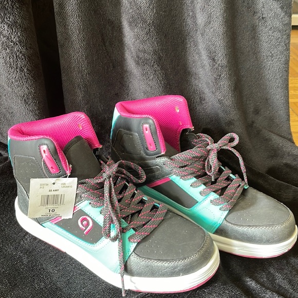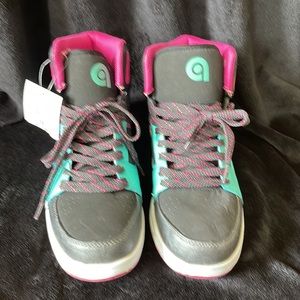 It’s high above the ankle Turquoise, pink and black