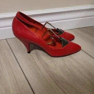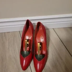 Beautiful red shoes.Medium heels, very comfortable for office or just for a night out.Brand name is Natale, a very soft leather, soles is stamped as italian leather. I found it very versatile in matching with different wardrobe items.
