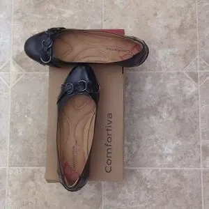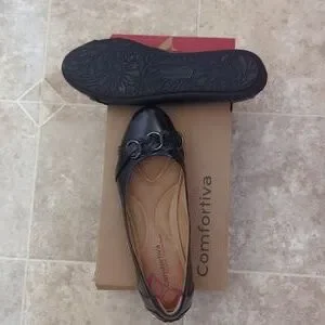 Luxe leather memory foam footed flat shoe. Slip try shoe. Black Patent medium width. Brand new my foot was to wide for the shoe.