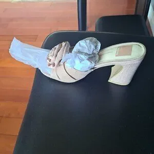 Mauve canvas sandal. A flower tops off these sandals. 3 3/4 inch heel Brand new with tissue and box