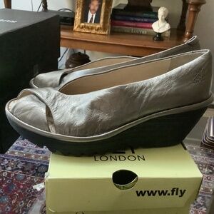 New, London Fly, soft leather wedge shoes, pewter colour.