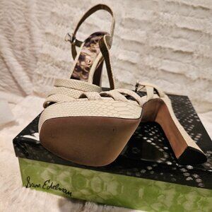 Elevate your style with these chic Sam Edelman platform sandals in a light neutral tone. Featuring a stylish textured finish, adjustable ankle strap for a perfect fit, and a comfortable platform heel, these shoes are ideal for summer events, nights out, or adding flair to any outfit.