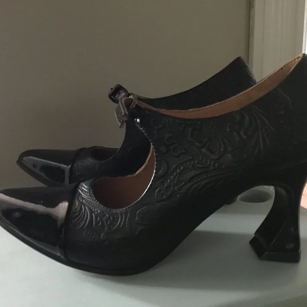 John Fluevog Malala mary jane heels. Patent leather, embossed leather,
