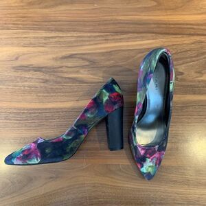 Gorgeous classic pump from Tahari. Multi coloured fabric upper in shades of navy, fuchsia and sage green. Fabric has a suede like texture. 3 1/2 inch stacked heel: great looks and sturdy. Excellent used condition with no damage or stains detected. Heel and interior are as new, slight wear showing on bottom. Size 7 1/5. Wear with all your favourites, great colours to brighten your wardrobe. Add some complimenting pieces from Our Closet (some suggestions shown all listed and priced separately), build a bundle and save a bundle. Fashion is Fun and Fresh, from Lemon Squeezy Shop🍋🍋