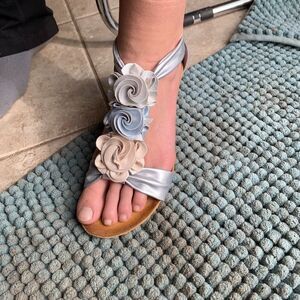Shoe/sandal, wedge heel, size 39 or 8, never worn, metallic silver, roses detail