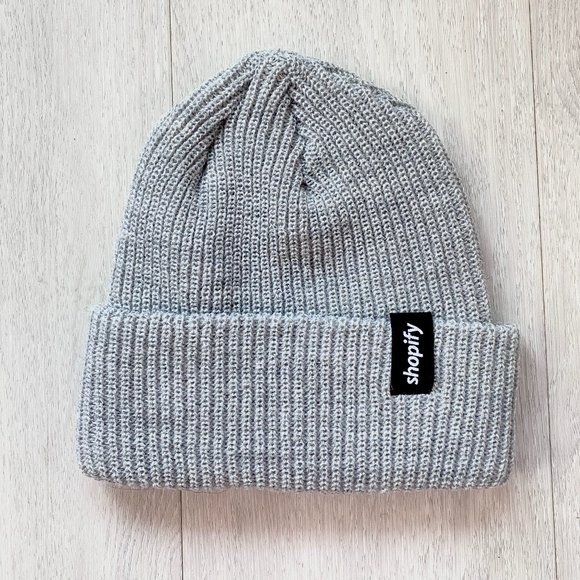 Basic grey ribbed beanie with Shopify logo. Originally did not come with any tags, but is brand new!