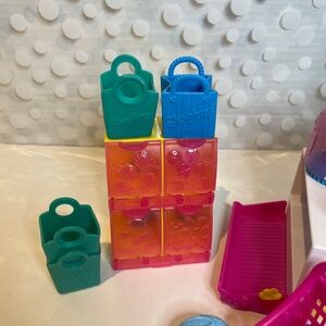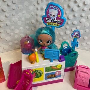 Shopkins Pick n Pack Small Mart cashier stand with candy shelf bin unit, shopping baskets and Sweet Spot bow cases