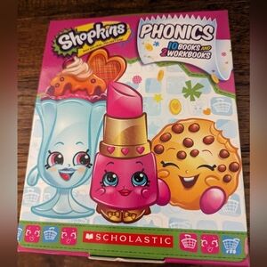 First-time readers can now follow along with their favorite Shopkins characters while they learn their phonics sounds. This set includes ten Shopkins stories written specifically to help children learn long and short vowel sounds, as well as two phonics workbooks to practice--all in a sturdy box with a plastic handle.