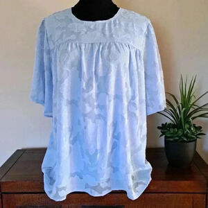 ❤️ Short Bell Sleeve Blouse Crewneck Medium Tops Floral Blue Textured Shirt