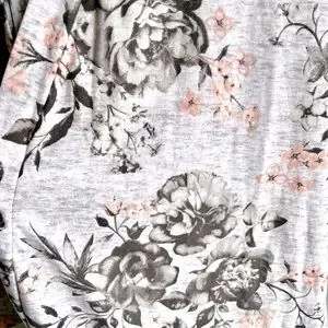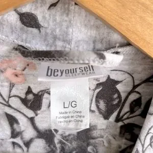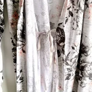 Soft lightweight grey robe with black and peachy pink floral pattern in women’s size large. This housecoat is in excellent used condition, worn only a couple of times.