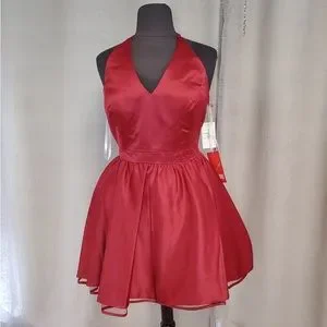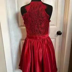 Burgundy halter style satin dress with lacy back. Store sample in excellent condition. Size XL Bust 40, waist 32.5, Hip 44. Ships next business day.
