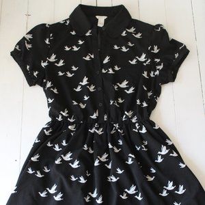 A short sleeve flowy collared mini dress with front button closure and cinching elastic waist. Pretty white dove print with black base.