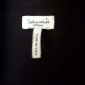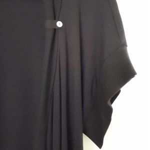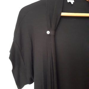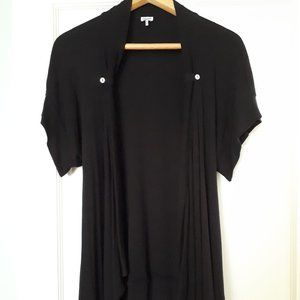 Lovely black, short sleeved cardigan by Splendid in size medium. Has sharkbite hemline and drop shoulder short sleeves. Drapes beautifully in front and has two pearly buttons for accent at shoulder. 50%Pima Cotton, 50% Modal. Soft and comfy, moves with you.