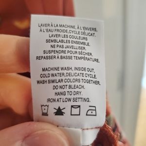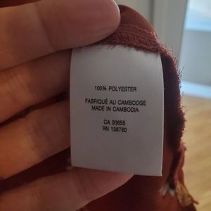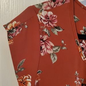 Cap Sleeve blouse from the R Essentials line at Reitmans. Really pretty orangey rust colour with a floral pattern that includes black, pink, yellow, and green.