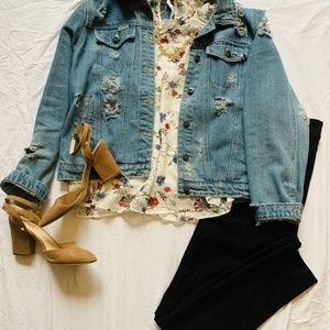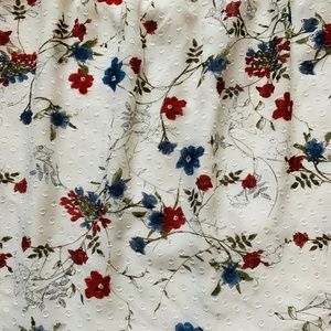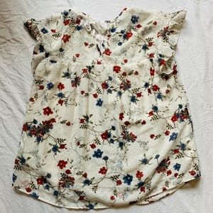 Perfect top for layering in the fall! Short flutter sleeves add a fun detail to this floral top. Design includes top sheer layer and second lined layer. Back ribbon detail.