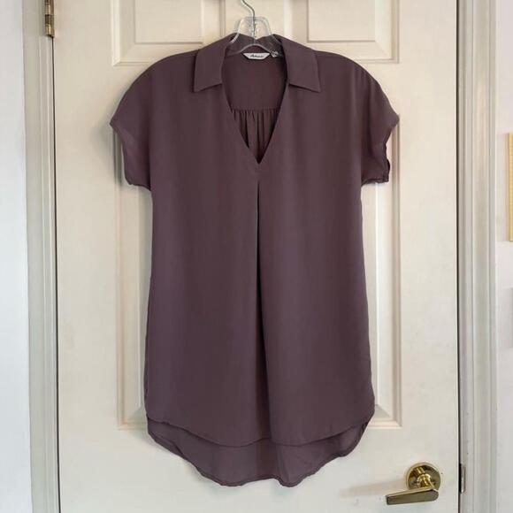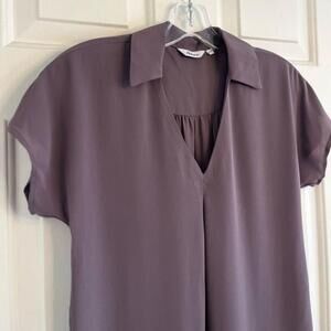 Reitmans Short Sleeve Drapey Flowy Johnny Collar Round Hemline V-neck Gray Purple Tunic Top Blouse XXS