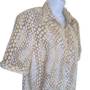 --- Short Sleeve Yellow and Brown Printed Blouse Size Large Petite (LP)