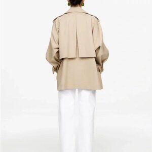 A new take on the iconic trench coat, this short version comes in a twill-woven blend of linen and cotton. The coat offers a voluminous silhouette with a hidden press-button closure and features classic details such as shoulder epaulettes, sleeve straps, a rain guard, and gun flap.