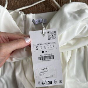 white colored balloon dress. brand new with tags from ZARA. size small but fits like an XS. haven’t worn because i feel it’s too small on my chest. back zipper. skinny straps that cross in the back, ir you could tuck them to make it strapless.
