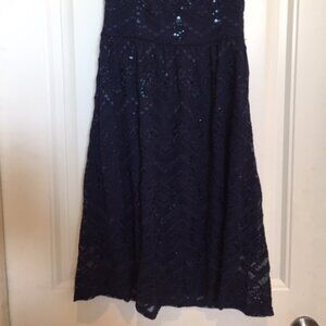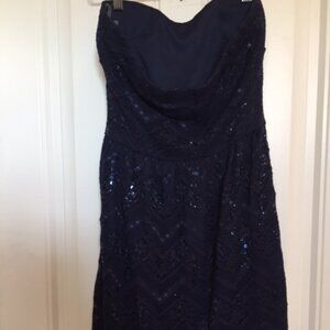 Little strapless dress with sequins, flared, stretchy, lined skirt. Brand : Yellow Star. Fabric : 95% Polyester/5% spandex. Color : Navy. Size : S. ** Worn only once, like new.