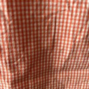 Short sleeve button down shirt, orange, and white plaid. Great for wearing on its own or as a layer.