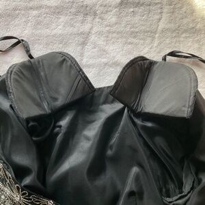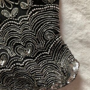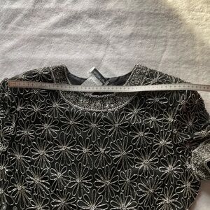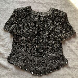 100% silk blouse with polyester lining. Covered in flower motif silver beads. Size XL. Measurements are:pit to pit 50cm, shoulder to shoulder 44cm, shoulder to bottom hem 59cm, shoulder to end of sleeve 22cm, waist 46cm. Has a zipper and clasp closure at the back.