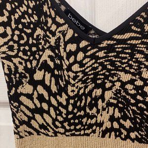 Extra small short V-neck short-sleeve dress from Guess. Sparkly black and gold panther pattern with gold stripe across waist. Stretchy fabric; Nylon and Spandex.