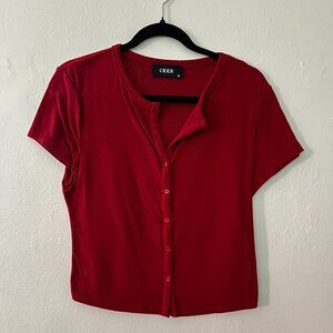 Red, short sleeved button down top. Never worn, it was just a little tight on me.