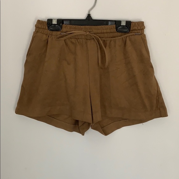 Suede look, dark brown, elastic waist shorts. Features draw strong at the front and side pockets.