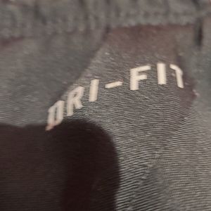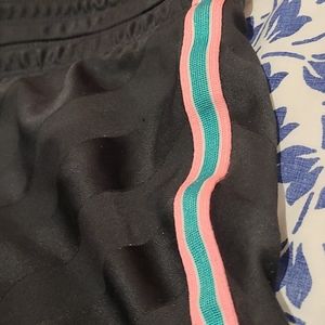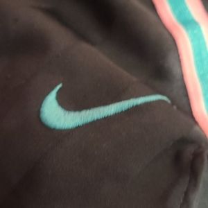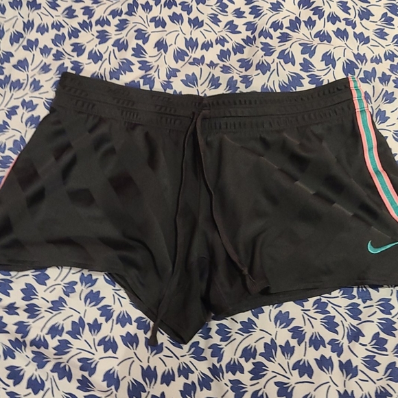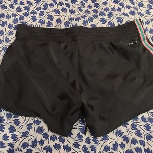 Black Nike dri fit shorts with pink and green stripes on the bottom and teal swoosh