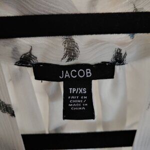 Short sleeved, lightweight, white with feather pattern. Suited well for festive occasions and/or work.