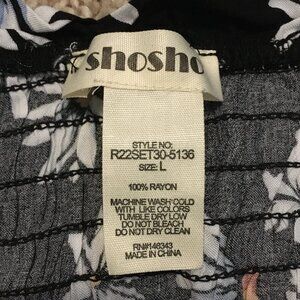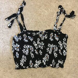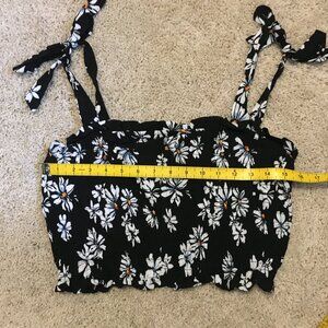 Good preowned condition black ruched summer, tie shoulder, crop top by Shosho with white and yellow daisy clusters printed throughout. Super sweet. With any rayon item, this item should be carefully laid flat to prevent uneven stretchy and deformities when drying.