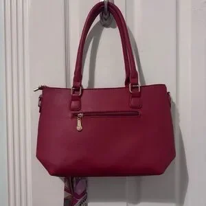 This stylish red handbag features a unique woven design and comes with a chic scarf accent. Comes with a bag strap.