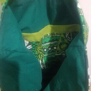 Handbag is mixture of fabrics, cotton, poly blend, with a cotton lining