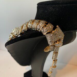 Shoulder brooch articulating Panther with rhinestone and green emerald art deco.