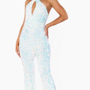 Make a chic statement in this white sequin plunging jumpsuit. The choice is yours - tie as a halter, or twist at the neck for an interesting neckline.