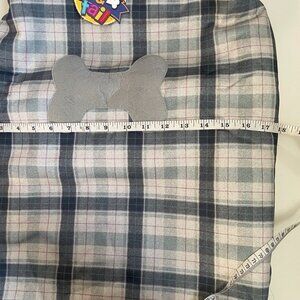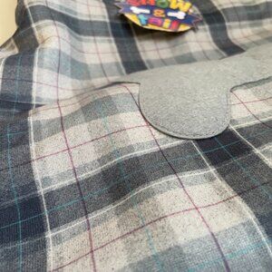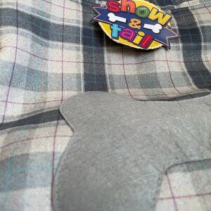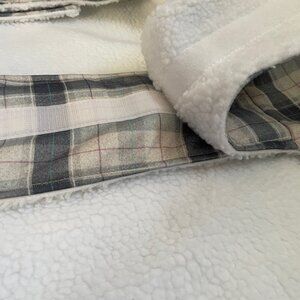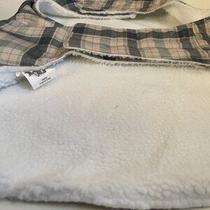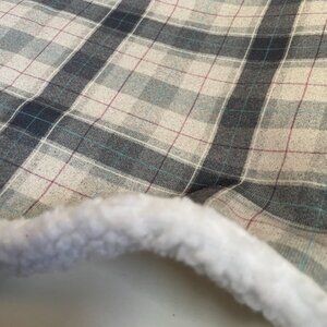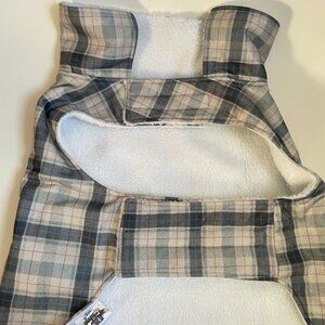 Cozy plaid dog coat with soft sherpa lining and a cute grey bone patch detail