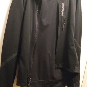 Waterproof, lined Showers Pass jacket approx. 14 yrs old but barley used.Exc. condition. Size is Med so for someone over 6 ft 180 it will be a tighter fit in torso but still lots of length in the arms. Lots of zippers, vents.Zippers all working great, Nice looking jacket for road biking or MTN