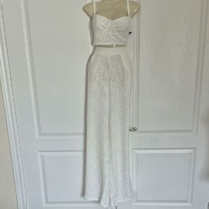 Chic white two-piece with textured fabric. Includes a stylish crop top and matching pants. Ideal for warm weather outings.