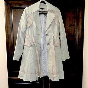 This one is a showstopper that no one else will be wearing. Wide lapel cinch waist A line pleated trench-coat with genuine leather trim shoulders, pockets and belt. Pleated bottom, military styling on top. It is a beautiful piece and pictures don’t do it justice. Pale blue/grey, EUC. Size S. multi seasonal and versatile, dresses up or down easily. Exceptional stitching details.