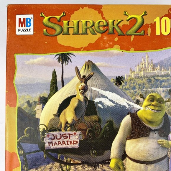 This Milton Bradley Shrek 2 100 piece jigsaw puzzle is sealed, as new. Features Shrek and Fiona and Donkey with a Just Married sign. Puzzle size 10 x 13 inch.