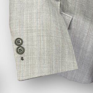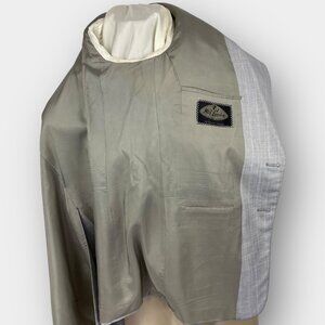 Sid Landen men's two-piece suit tailored in a soft light gray micro-check pattern. The blazer features a two-button single-breasted front, notched lapels, single rear vent, and three-button cuffs (one button missing on one sleeve); matching trousers are flat front. No visible size tag; based on flat measurements, this suit fits approximately a 42R. This vintage Canadian-made suit from Petawawa’s Merit Benchmark line offers a clean, classic profile in a blended wool fabric for year-round wear