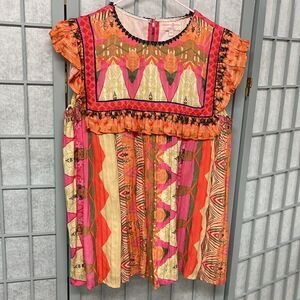 Vibrant bohemian blouse with intricate patterns. Features shades of pink, orange, and yellow. Perfect for a bold, stylish look.
