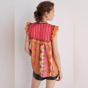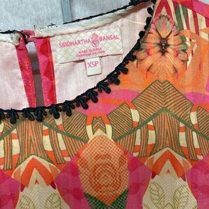 Vibrant bohemian blouse with intricate patterns. Features shades of pink, orange, and yellow. Perfect for a bold, stylish look.
